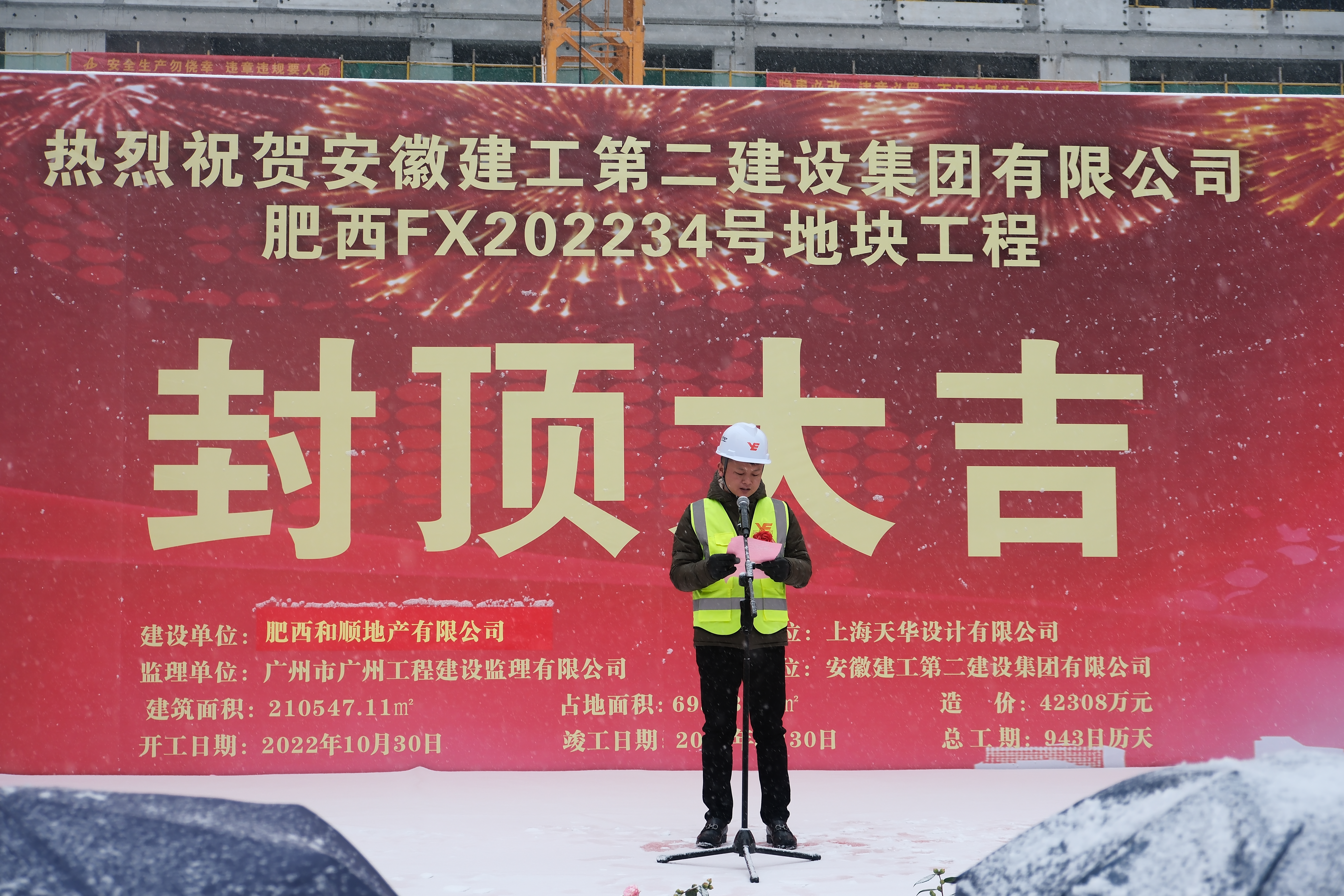 現(xiàn)場(chǎng),安徽建工第二建設(shè)集團(tuán)有限公司黨委副書記、副總經(jīng)理李登祥、廣州工程建設(shè)監(jiān)理有限公司安徽公司副總經(jīng)理鐘書安、保利發(fā)展公司西南片區(qū)工程部部長(zhǎng)潘向卿、越秀地產(chǎn)合肥公司副總經(jīng)理文彩致辭,相關(guān)建設(shè)、施工、監(jiān)理等單位的負(fù)責(zé)人一同為項(xiàng)目宣布封頂。