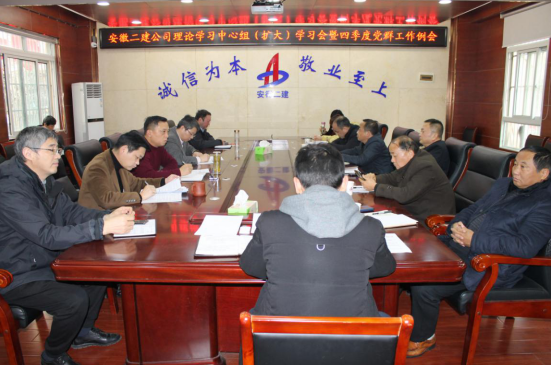 12月11日下午,安徽二建公司召開黨委理論學(xué)習(xí)中心組(擴大)暨四季度黨群工作會,公司領(lǐng)導(dǎo)班子、黨委工作部、紀檢監(jiān)察室、工會、團委、信訪保衛(wèi)部、人力資源部主要負責(zé)人,所屬各黨支部書記參加。會議由黨委副書記、紀委書記仇多維主持。