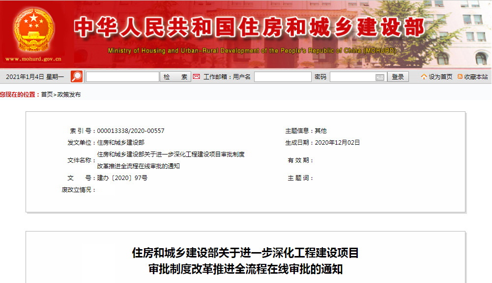 近日,住房和城鄉(xiāng)建設(shè)部印發(fā)通知,要求深化工程建設(shè)項(xiàng)目審批制度改革,加快推進(jìn)工程建設(shè)項(xiàng)目全流程在線審批,不斷提升工程建設(shè)項(xiàng)目審批效能,優(yōu)化營商環(huán)境。