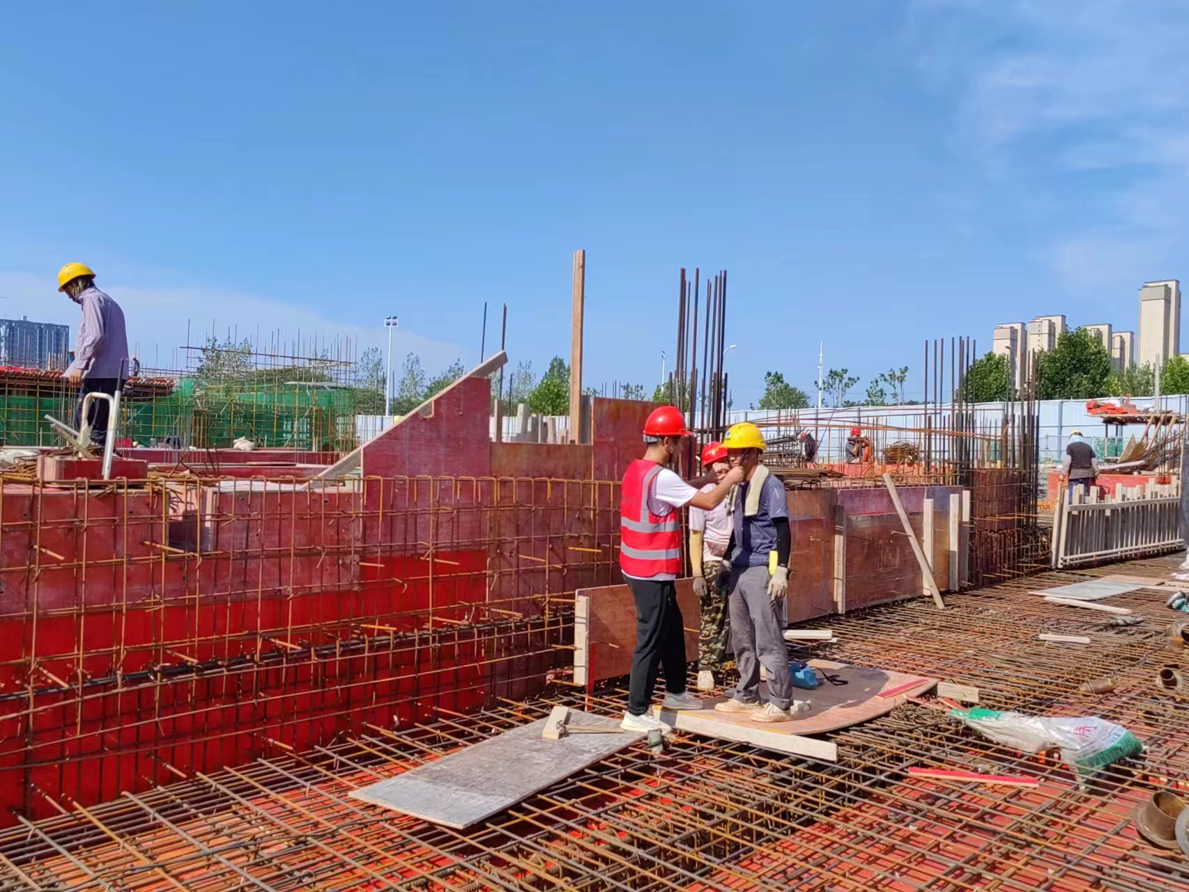 施工現(xiàn)場(chǎng),工人們揮汗如雨,辛勤勞動(dòng)