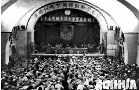 4月23日,在延安楊家?guī)X中央大禮堂,七大開幕式的主席臺(tái)上,懸掛著毛澤東和朱德的巨幅畫像,鮮艷的黨旗掛在兩邊。會(huì)場(chǎng)后面的墻上,掛著“同心同德”四個(gè)大字。兩側(cè)墻上張貼著“堅(jiān)持真理”“修正錯(cuò)誤”等標(biāo)語(yǔ),靠墻邊插著24面紅旗,象征著中國(guó)共產(chǎn)黨24年奮斗的歷程。插紅旗的“V”字形木座是革命勝利的標(biāo)志。在主席臺(tái)的正上方,懸掛著一條引人注目的橫幅:“在毛澤東的旗幟下勝利前進(jìn)!”